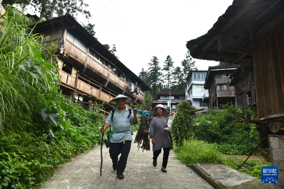 在融水苗族自治縣桿洞鄉堯告村,村民梁金玉(左)和妻子余蘭英走在回家的路上(8月14日攝)。