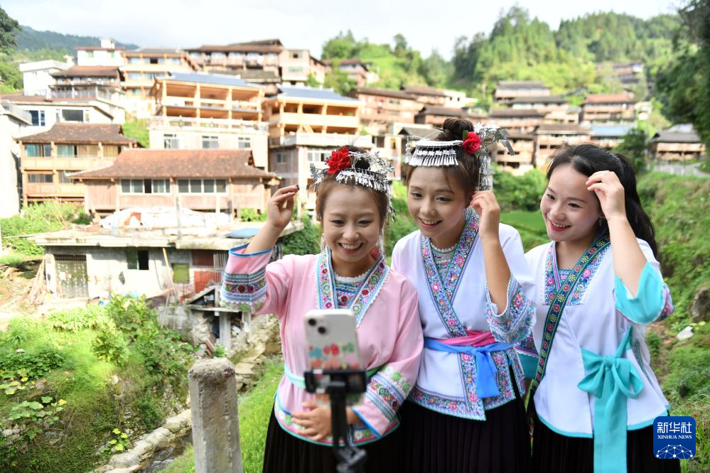 在融水苗族自治縣桿洞鄉堯告村,幾名大學生在準備做直播(8月13日攝)。