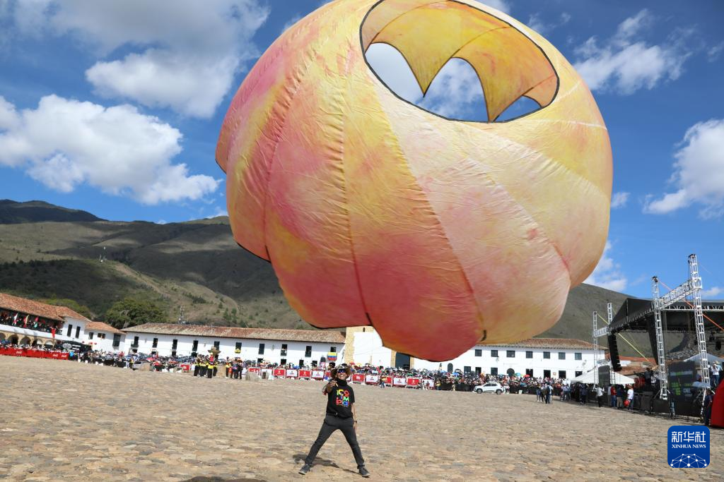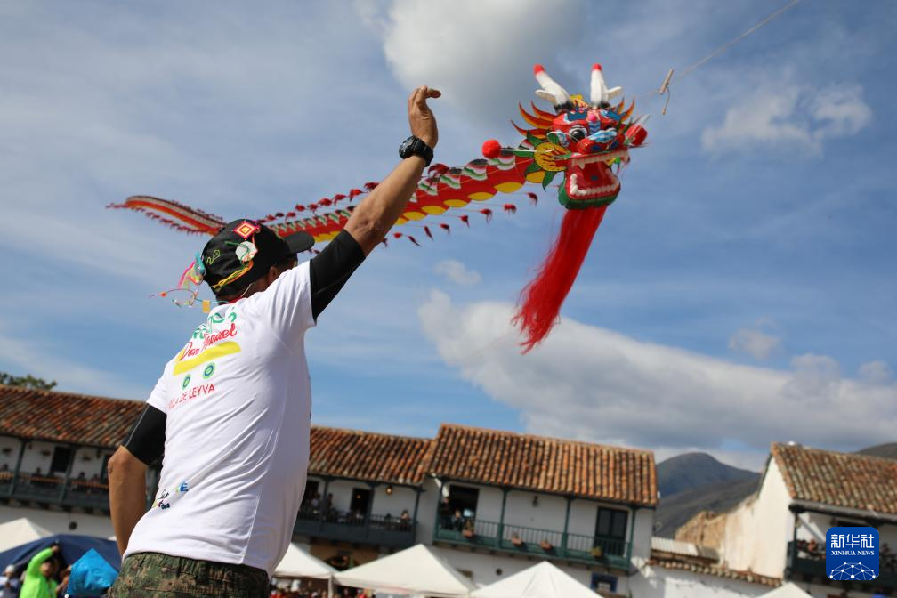 8月17日,在哥倫比亞萊瓦,工作人員向空中飄過的中國龍頭風箏揮手。