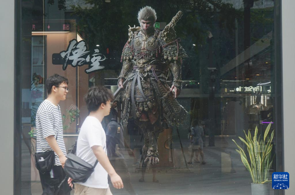 8月20日,在杭州街頭,游戲愛好者從游戲《黑神話:悟空》中悟空的形象海報前走過。