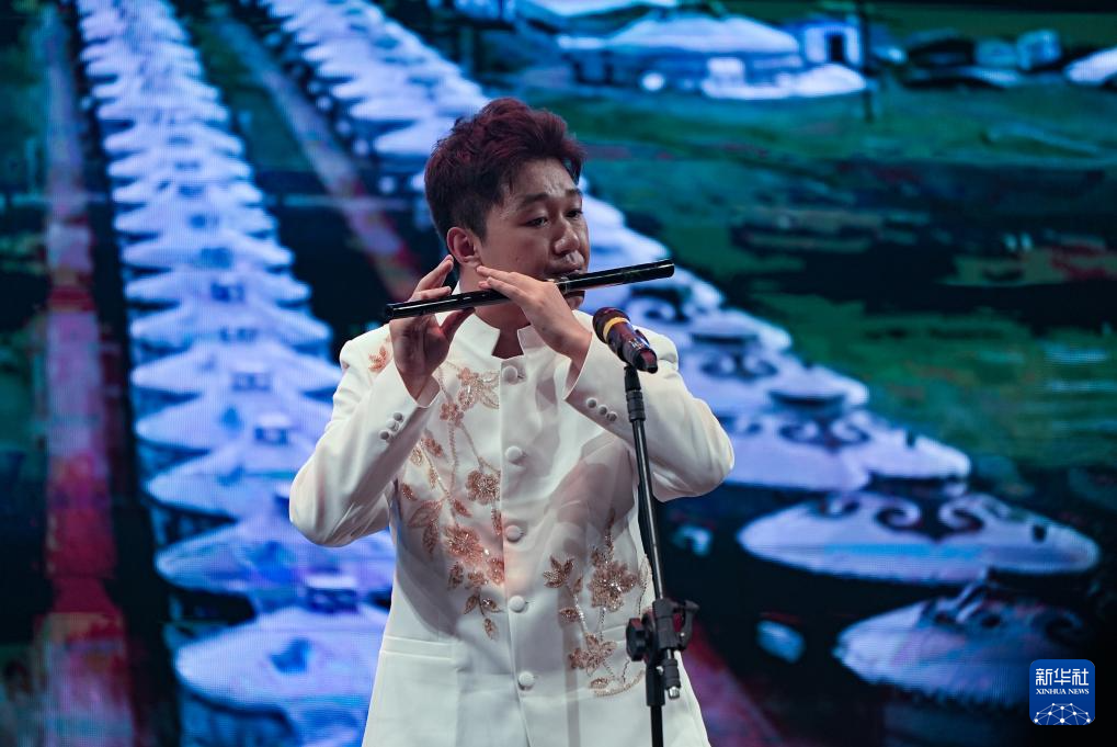 8月18日,在巴西圣保羅,西北民族大學藝術團成員在“中國的色彩:民族萬花筒”晚會上吹奏笛子。