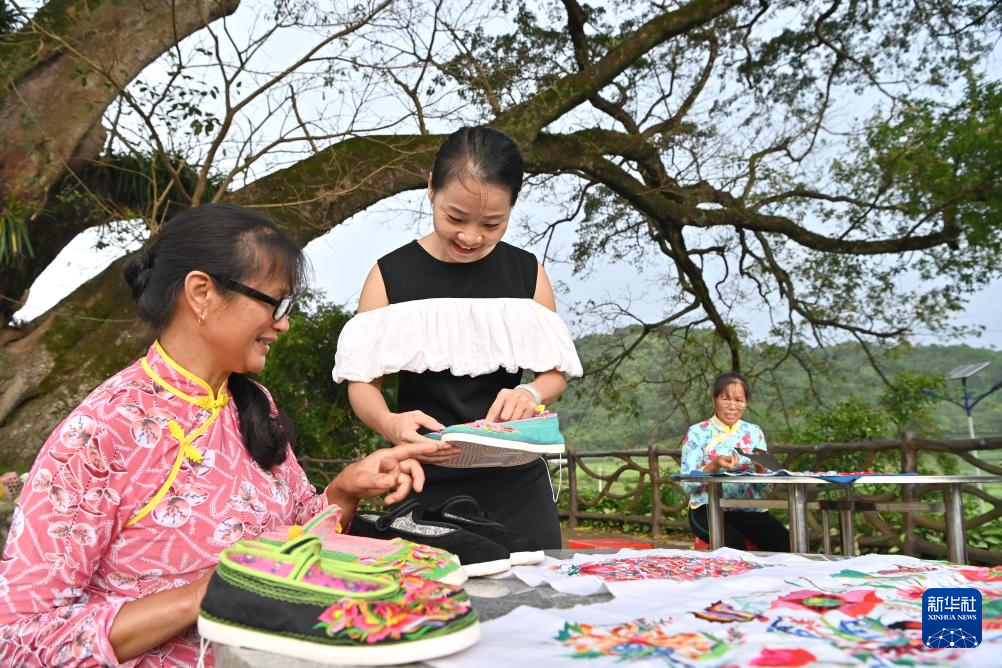 凌漫麗(右)在田東縣義圩鎮朔晚村跟村民探討繡品花樣(8月20日攝)。