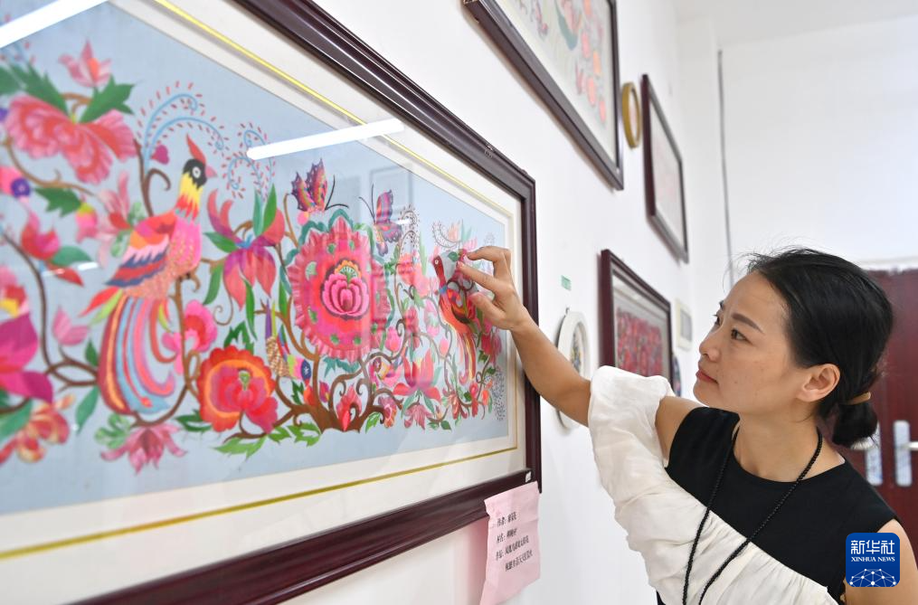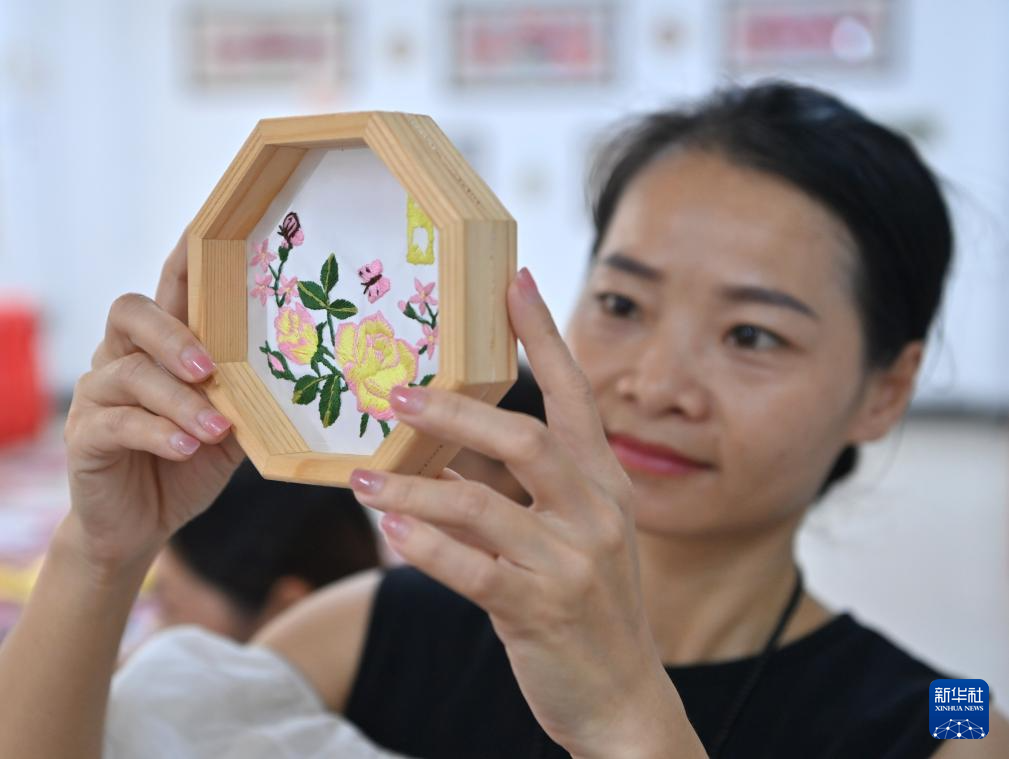 凌漫麗在田東縣義圩鎮七里刺繡基地展示她和村民制作的工藝品(8月20日攝)。