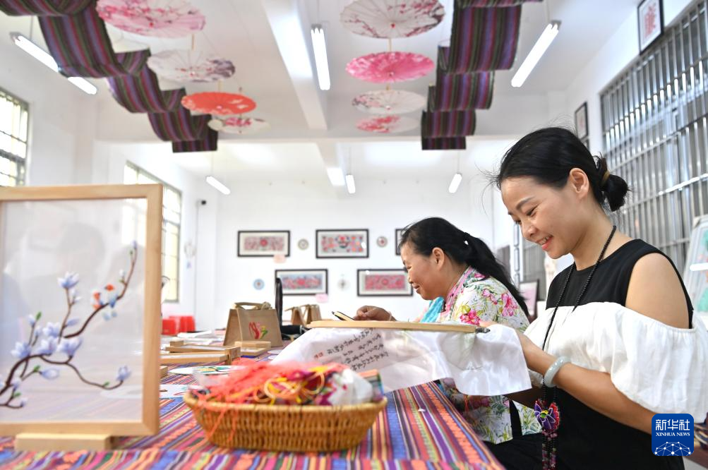 凌漫麗(右)在田東縣義圩鎮七里刺繡基地做刺繡(8月20日攝)。