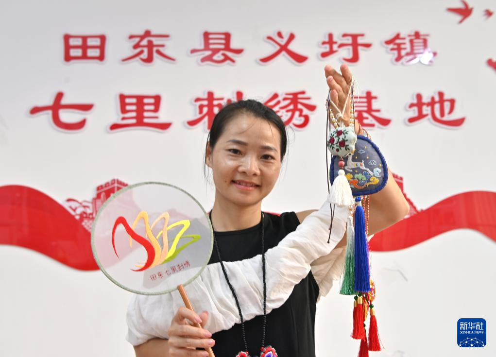 “我從小就跟著奶奶學刺繡,后來又跟著姑姑、阿姨學,在學習中不斷創新,已經以七里刺繡為基礎創作了12種工藝品。我要讓七里刺繡走出大山,讓越來越多的人接受;讓七里刺繡走進學校,走近孩子,讓阿奶的手藝代代相傳?!睆V西百色市田東縣義圩鎮朔晚村村民凌漫麗說。