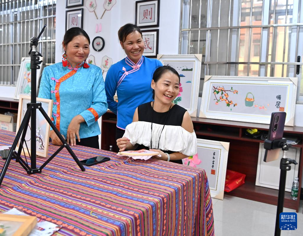 凌漫麗(右一)在田東縣義圩鎮七里刺繡基地和村民一起做直播(8月20日攝)。