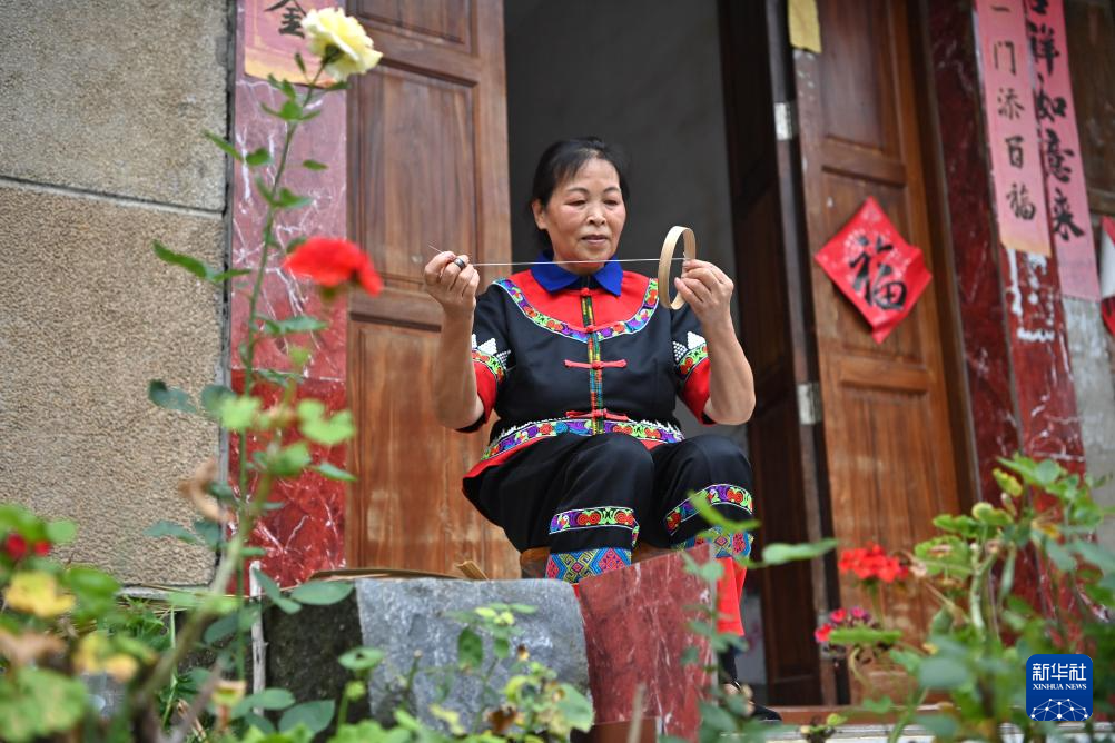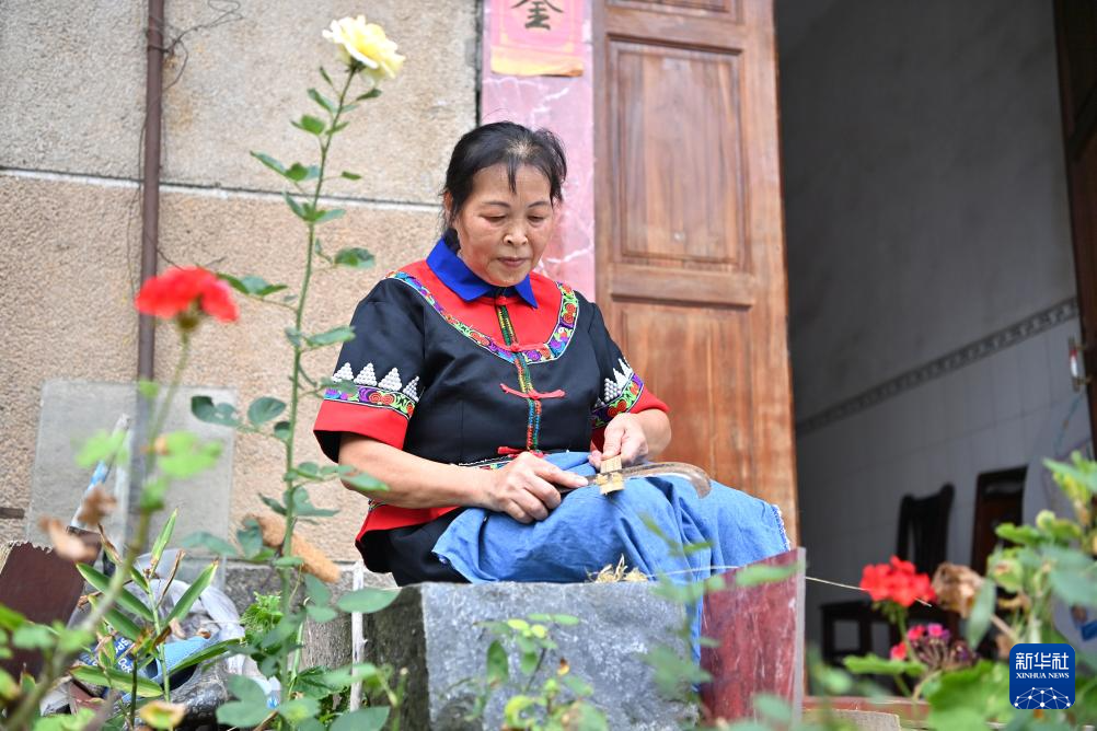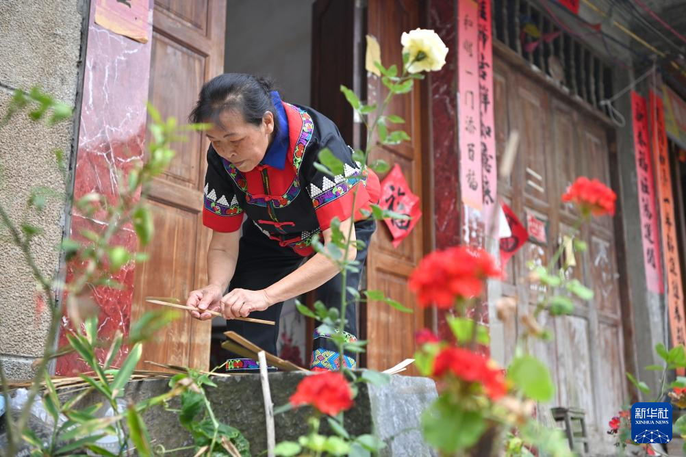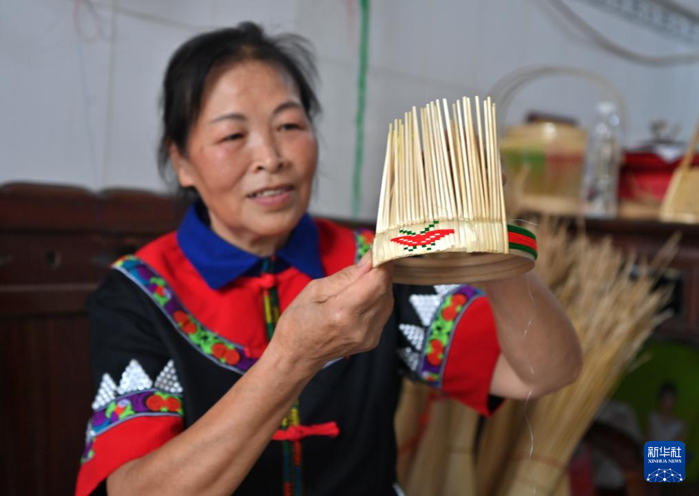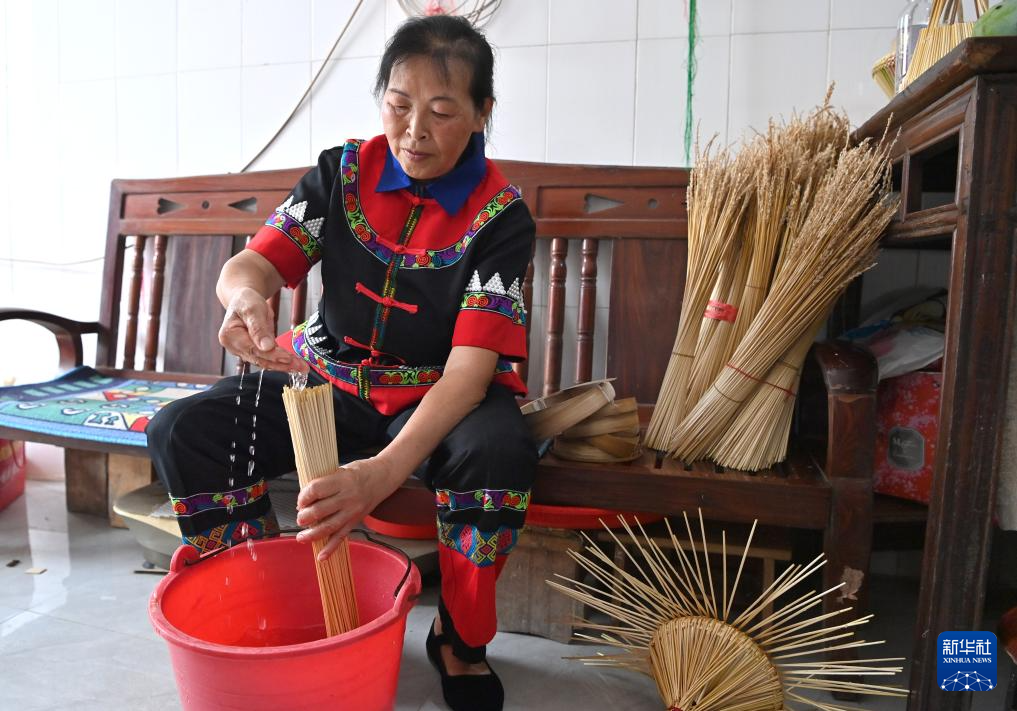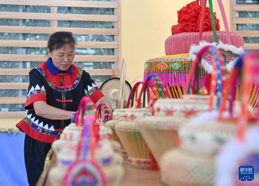 梁秀群在百色市田陽區巴別鄉三坡村民俗文化傳承館整理麥稈花籃(8月21日攝)。