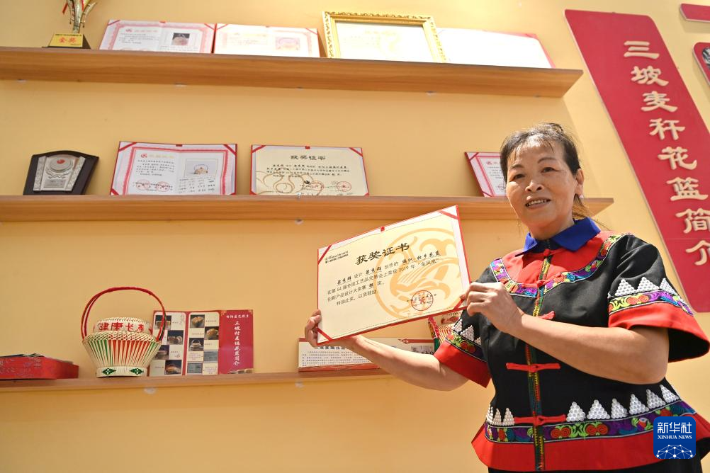 后來,隨著麥稈花籃的外貿銷路受阻,梁秀群也從縣外貿局返回村里,但她對于麥稈花籃編織一直癡心不改。她不斷提升花籃編織技藝,對花籃的外觀和樣式進行創新,還把這項技藝教給鄉鄰,組建了巴別三坡麥稈花籃編織小隊。在她的帶動下,僅三坡村就有30多人從事麥稈花籃編織工作。
