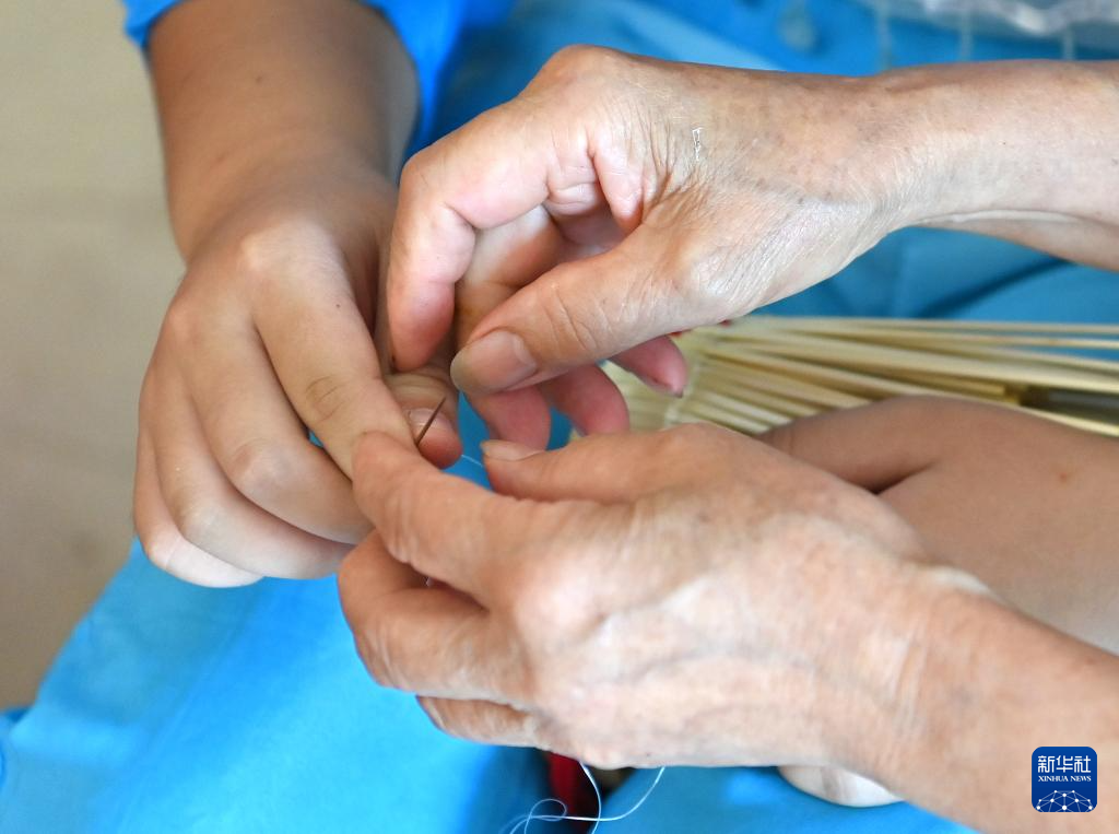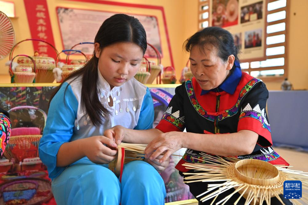 梁秀群(右)在百色市田陽區巴別鄉三坡村民俗文化傳承館教14歲的陸新睿編織麥稈花籃(8月21日攝)。