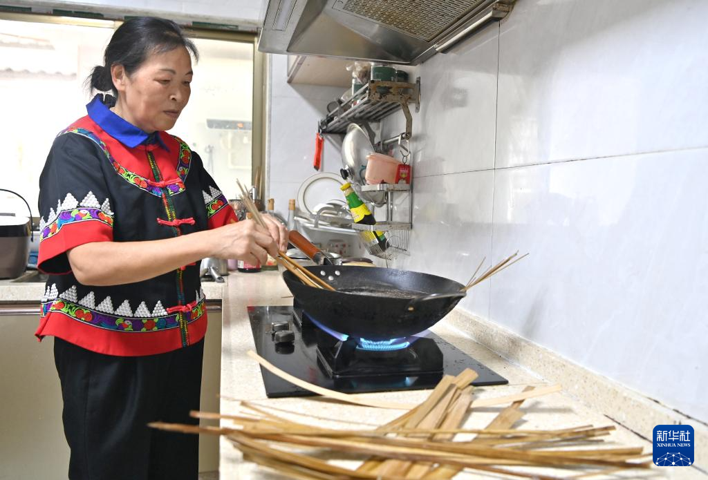 梁秀群在百色市田陽區巴別鄉三坡村自家灶臺煮竹篾(8月21日攝)。
