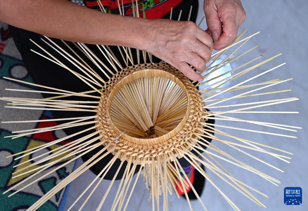 梁秀群在百色市田陽區巴別鄉三坡村自家門前將竹篾定型(8月21日攝)。