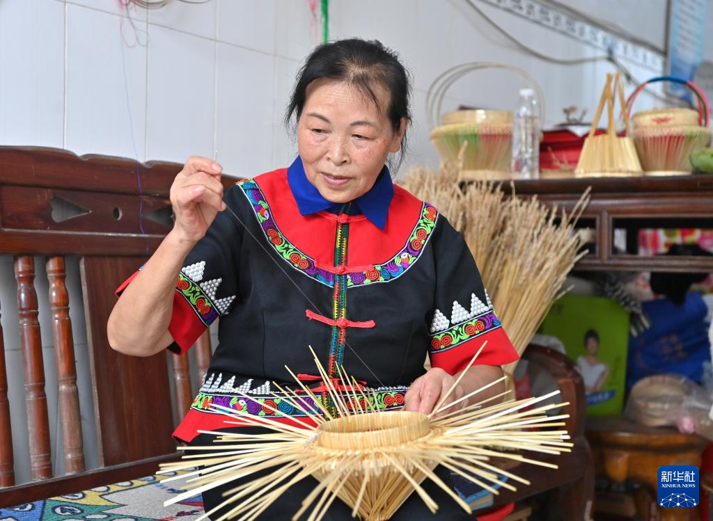梁秀群在百色市田陽區巴別鄉三坡村編織麥稈花籃(8月21日攝)。