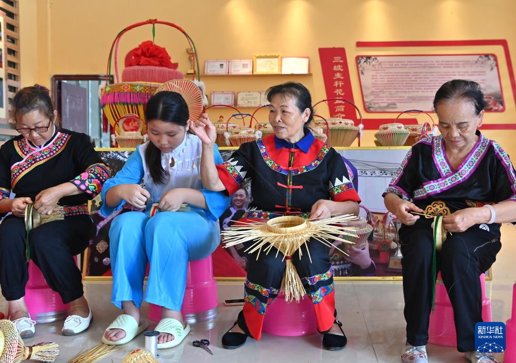 梁秀群(右二)在百色市田陽區巴別鄉三坡村民俗文化傳承館和她的編織小隊在編織麥稈花籃(8月21日攝)。