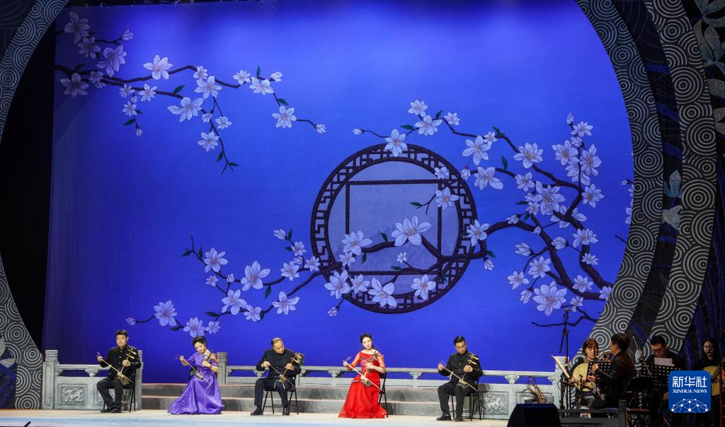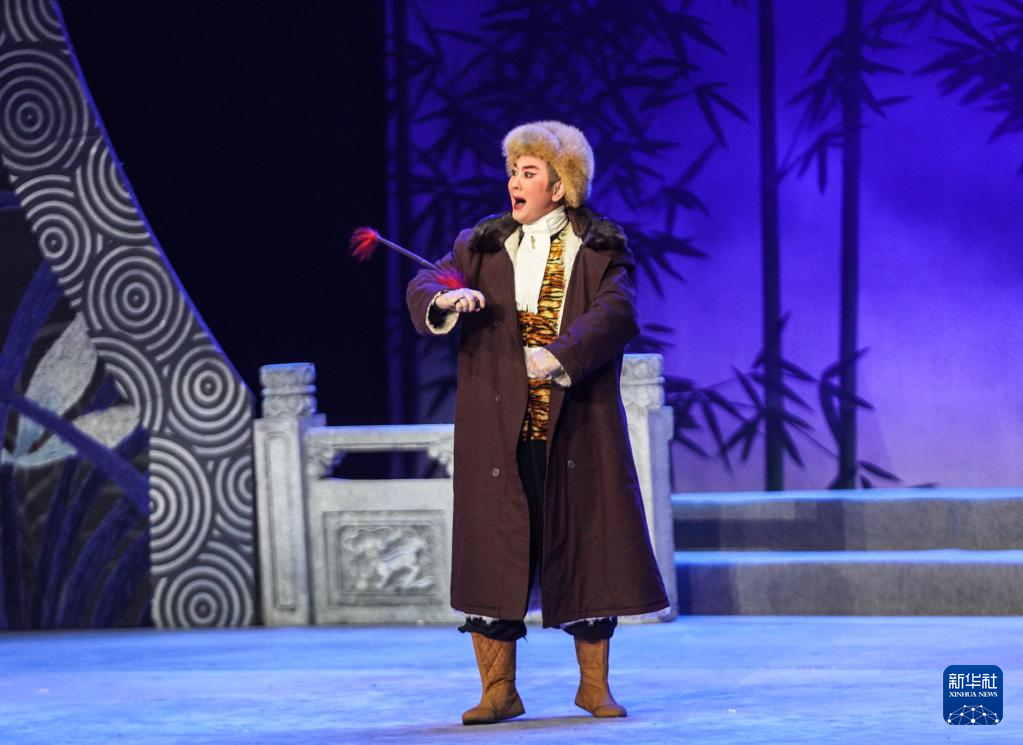 8月29日,京劇演員在吉林市人民大劇院表演京胡協奏曲《迎春》。
