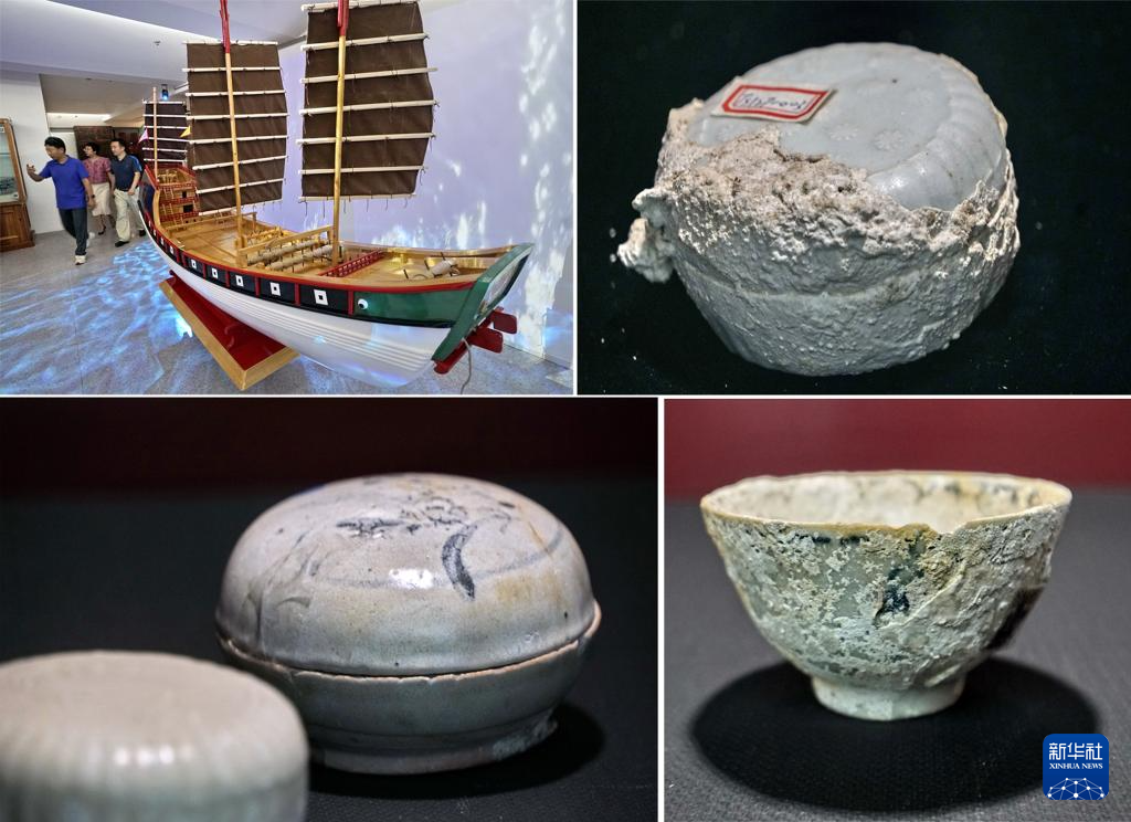 拼版照片:左上圖為“泰興號”沉船的復制模型(8月31日攝);其他圖均為展出的清代瓷器(8月31日攝)。