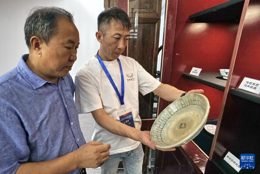 8月31日,海洋文化專家朱瑞良(左)在展覽現場研究打撈出水的清代瓷器圖案。