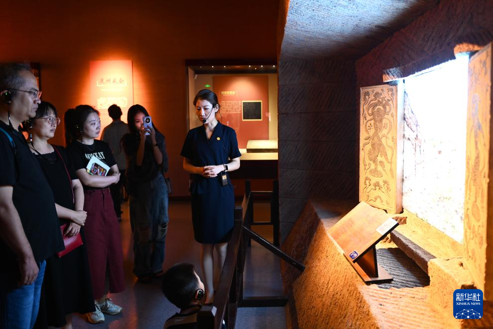 9月1日,游客在寧夏博物館觀賞石刻胡旋舞墓門。