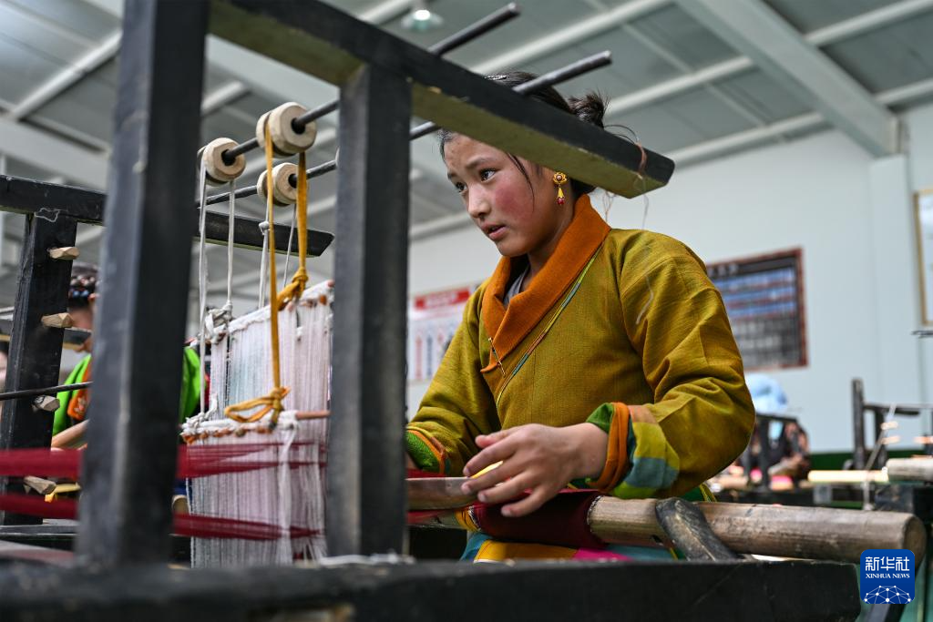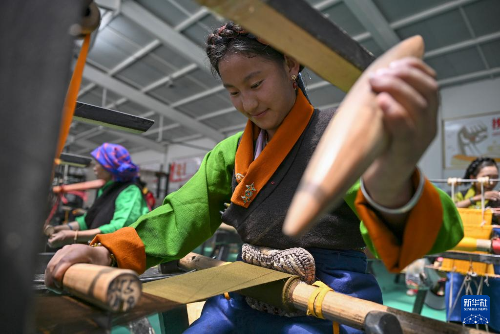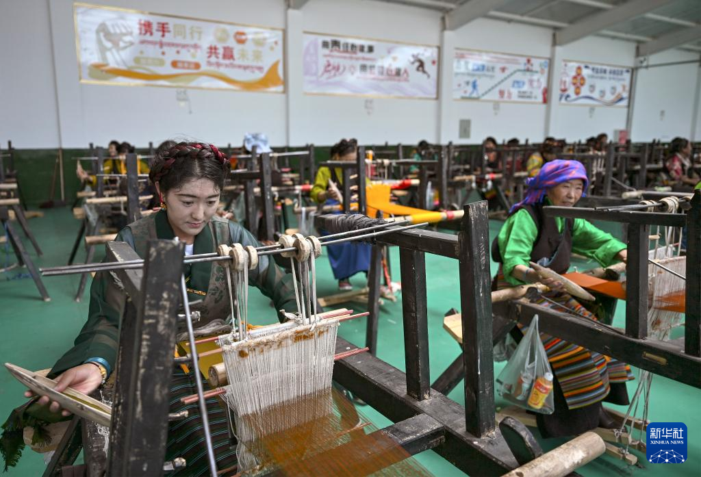 9月1日,在西藏日喀則市仁布縣特色產業孵化園,亞德細褐羊毛織品農民專業合作社工作人員在車間里織布。
