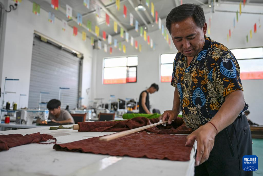 9月1日,在西藏日喀則市仁布縣特色產業孵化園,亞德細褐羊毛織品農民專業合作社工作人員在車間里準備剪裁布匹。