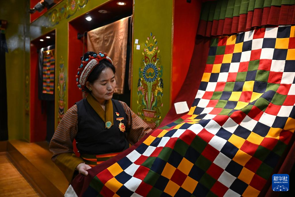 9月1日,在西藏日喀則市仁布縣特色產業孵化園,亞德細褐紡織手工藝傳承人南木珍查看展示的紡織品成品。