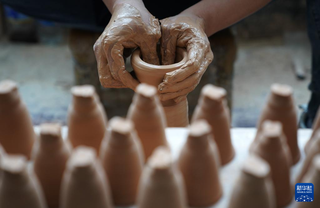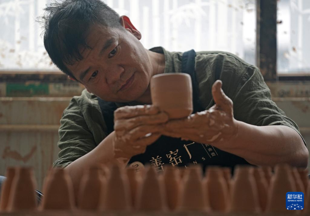 在位于江西省景德鎮市善窯廠的車間里,李善明在進行拉坯(8月28日攝)。