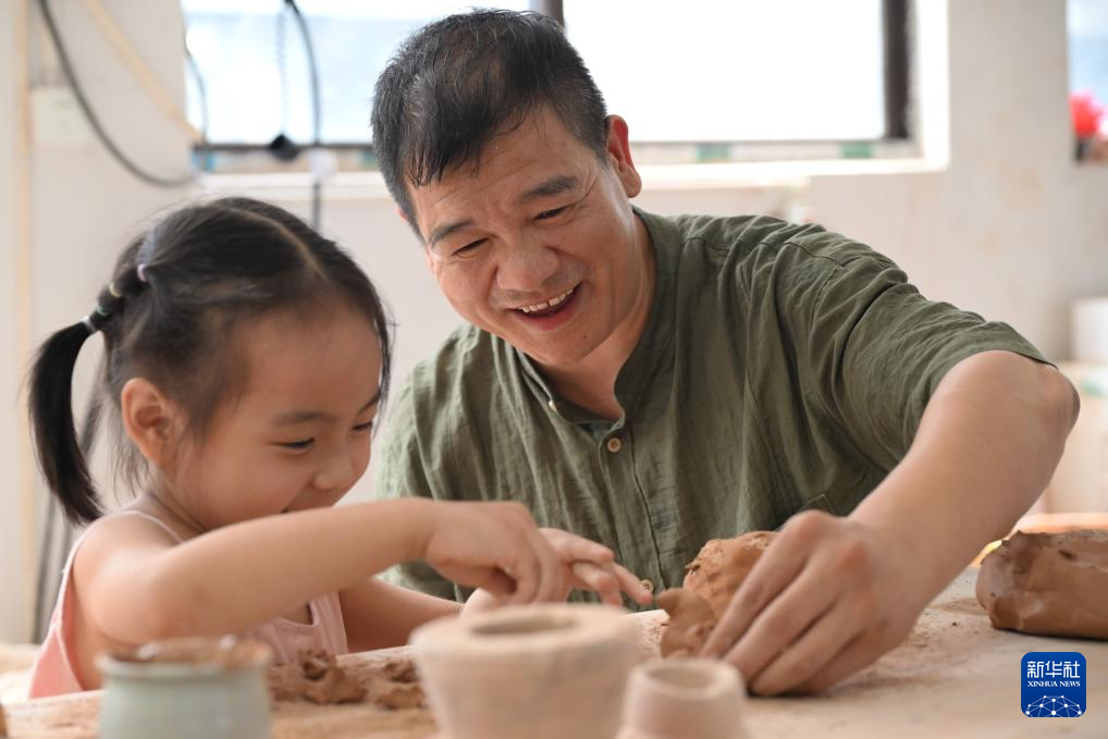 在善窯廠車間里,李善明(右)和女兒一起玩瓷泥(8月28日攝)。