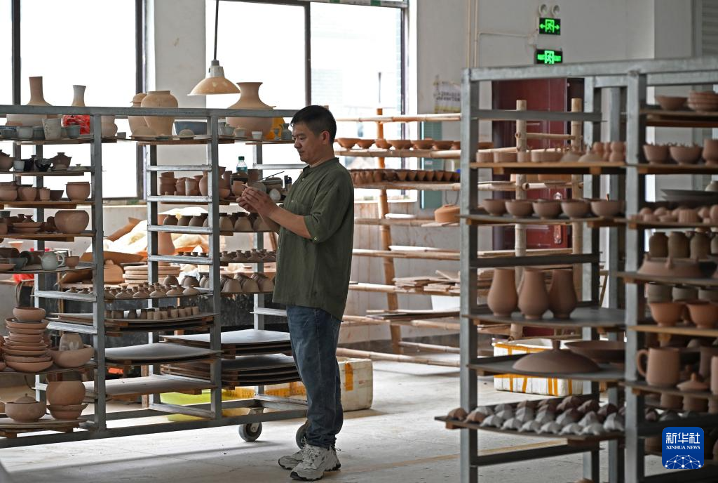 在位于江西省景德鎮市善窯廠的車間里,李善明在查看產品(8月28日攝)。