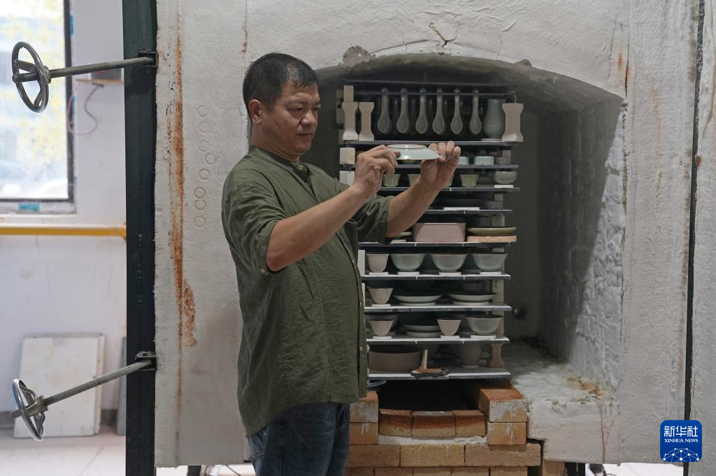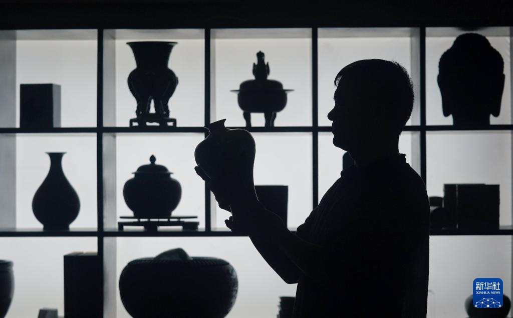 在位于江西省景德鎮市善窯廠展廳里,李善明在欣賞一件汝瓷作品(8月28日攝)。