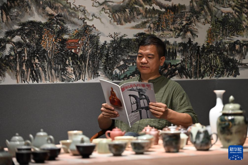 在善窯廠的工作室里,李善明在翻閱陶瓷相關書籍(8月28日攝)。