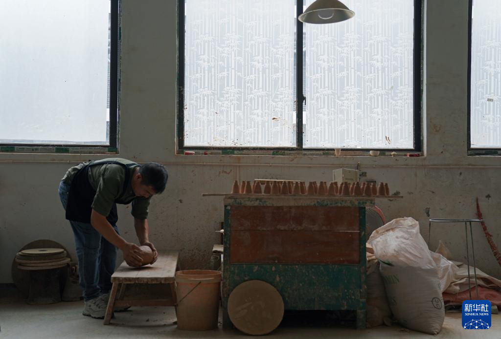 在位于江西省景德鎮市善窯廠的車間里,李善明在揉捏瓷泥(8月28日攝)。