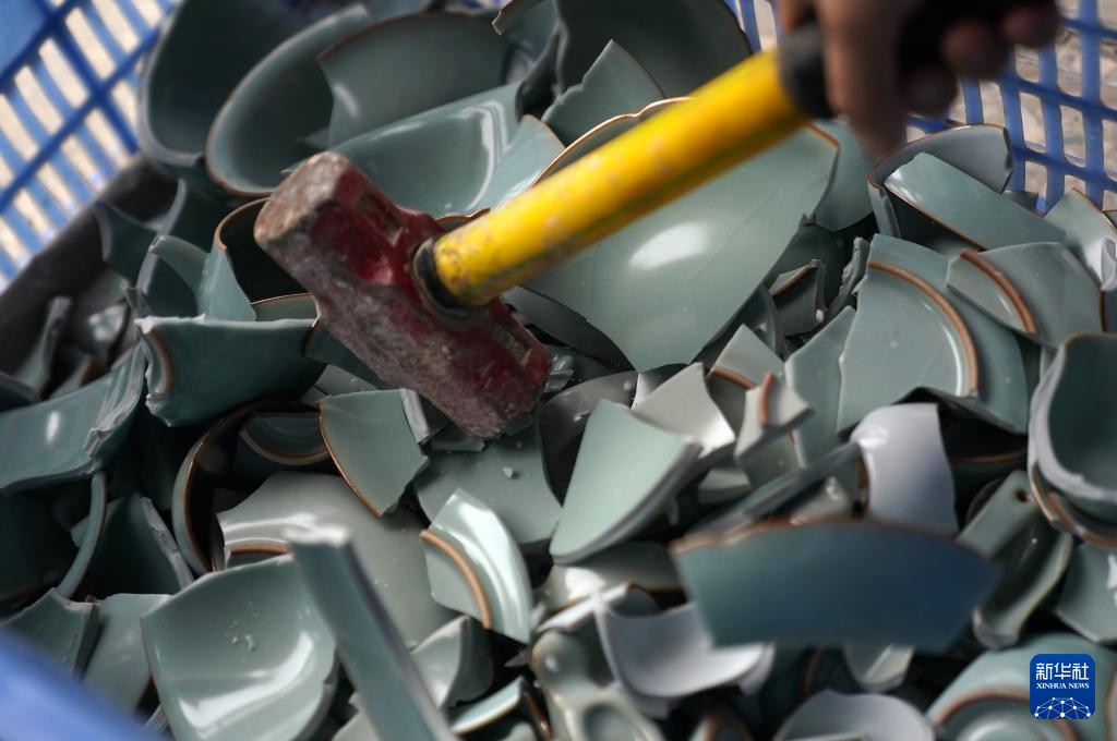 在位于江西省景德鎮市善窯廠的車間里,匠人將有瑕疵的汝瓷產品敲碎(8月28日攝)。