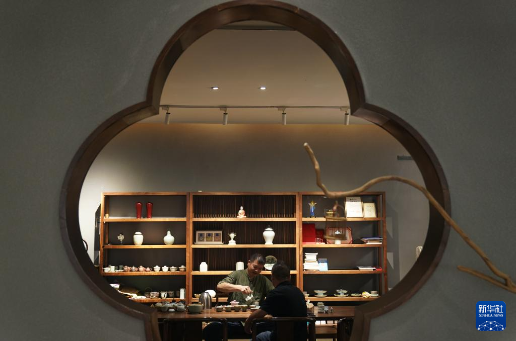 在位于江西省景德鎮市善窯廠展廳里,李善明(左)在使用自制的汝瓷茶器與朋友喝茶(8月28日攝)。