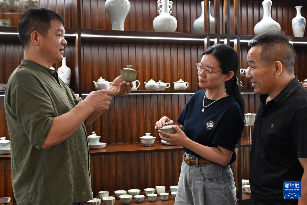 在位于江西省景德鎮市善窯廠的工作室里,李善明在通過直播介紹自己的汝瓷產品(8月28日攝)。