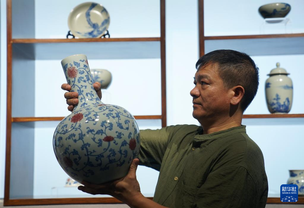 在位于江西省景德鎮市善窯廠展廳里,李善明在欣賞一件天青汝釉瓷瓶(8月28日攝)。