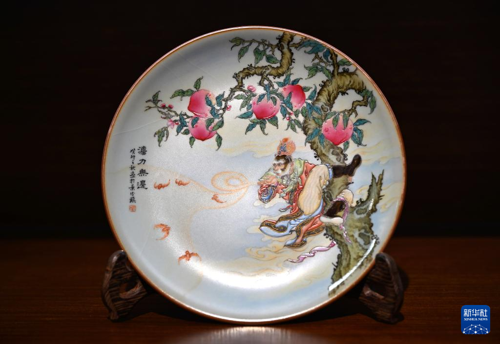 這是李善明燒制的汝瓷作品《西游記系列瓷盤》(8月28日攝)。