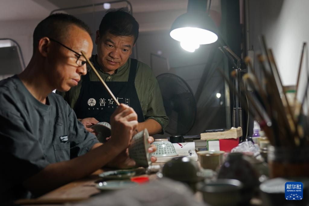 在位于江西省景德鎮市善窯廠的車間里,李善明(右)在與畫工交流(8月28日攝)。