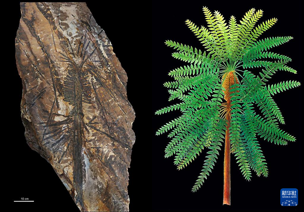 這是在內蒙古自治區烏達二疊紀植被化石產地發現的植物化石及植物復原圖(資料圖片)。新華社發