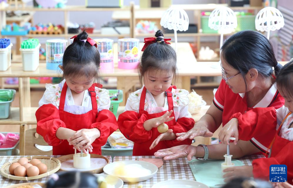 9月4日,在河北省石家莊市藁城區通安幼兒園,小朋友在老師的指導下學做手工月餅。