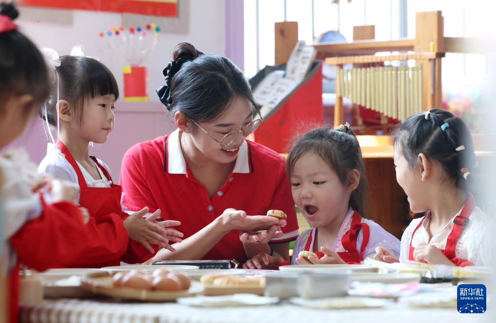 9月4日,在河北省石家莊市藁城區通安幼兒園,老師和小朋友一起制作手工月餅。