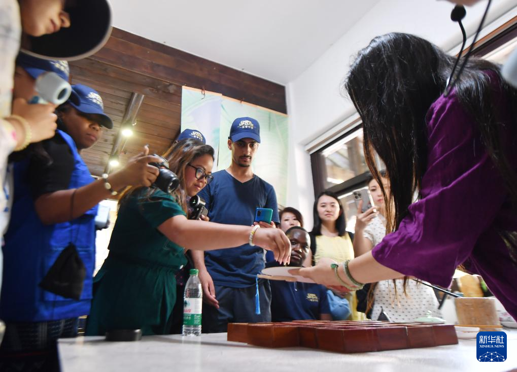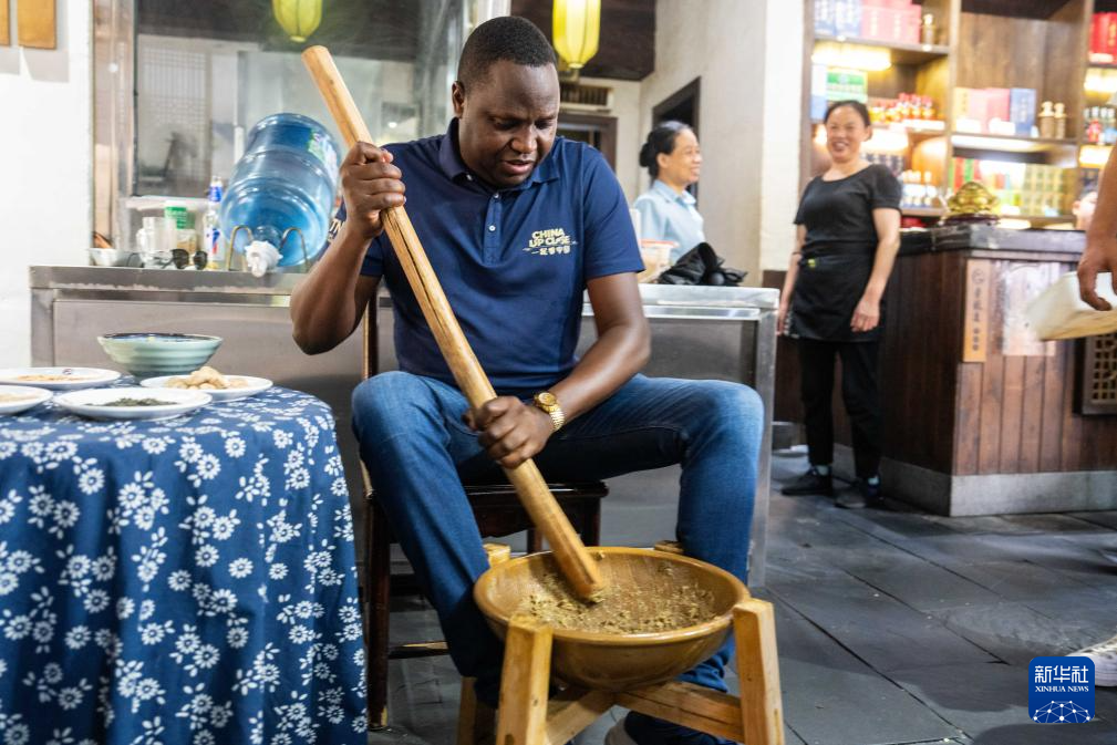 9月3日,在常德河街,外國游客體驗非遺美食擂茶的制作。