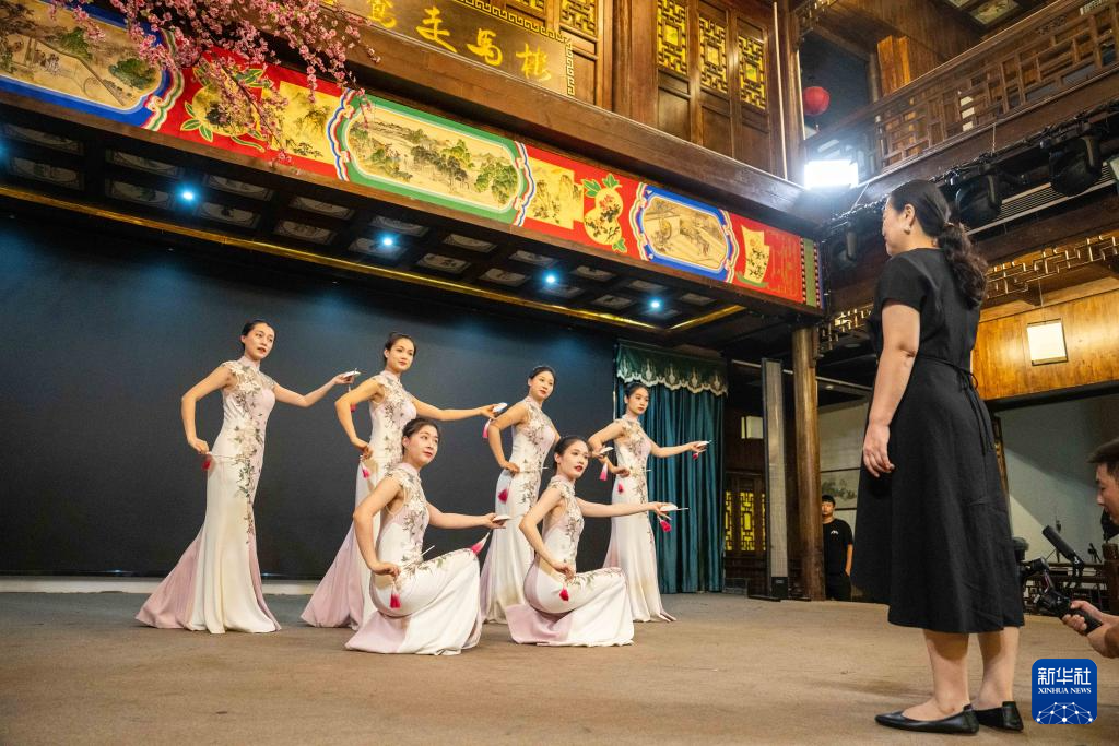9月3日,在常德河街,常德絲弦國家級非遺傳承人朱曉玲(右一)在演出前指導青年演員排練。