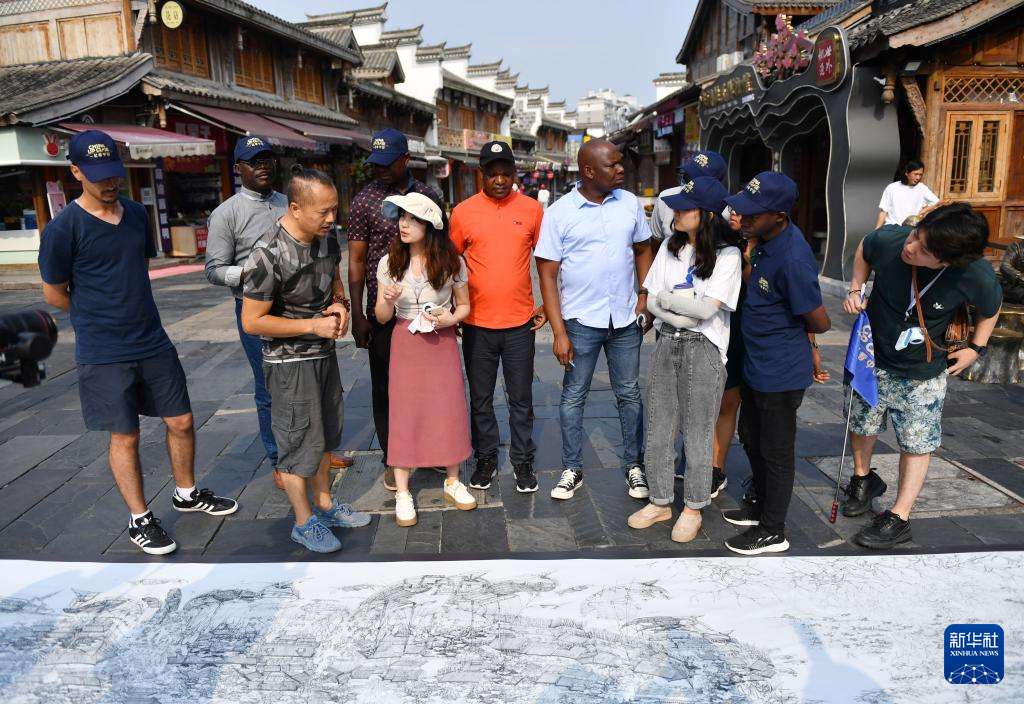 9月3日,在常德河街,外國游客體驗非遺麻質畫制作。