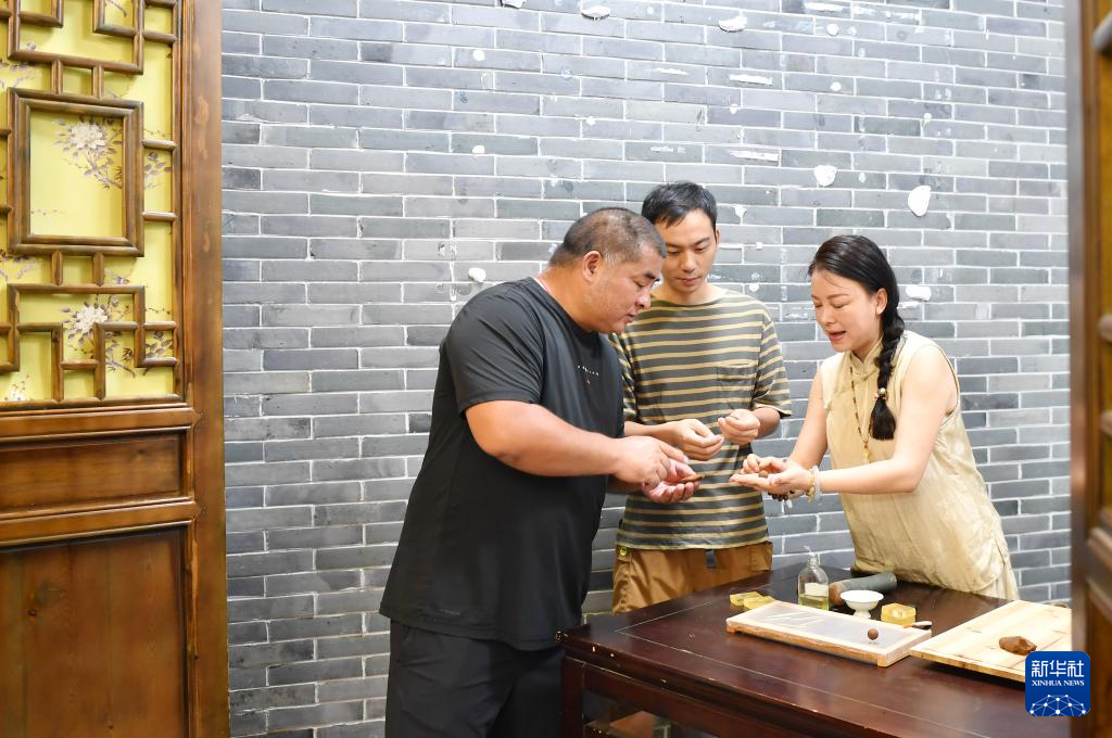 9月3日,在常德河街,傳統香制作技藝非遺傳承人鐘玲(右一)向游客講解熏香制作。