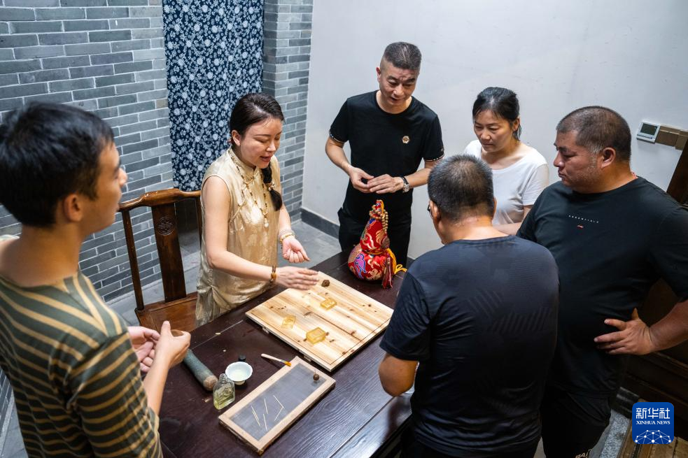9月3日,在常德河街,傳統香制作技藝非遺傳承人鐘玲(左二)向游客講解熏香制作。