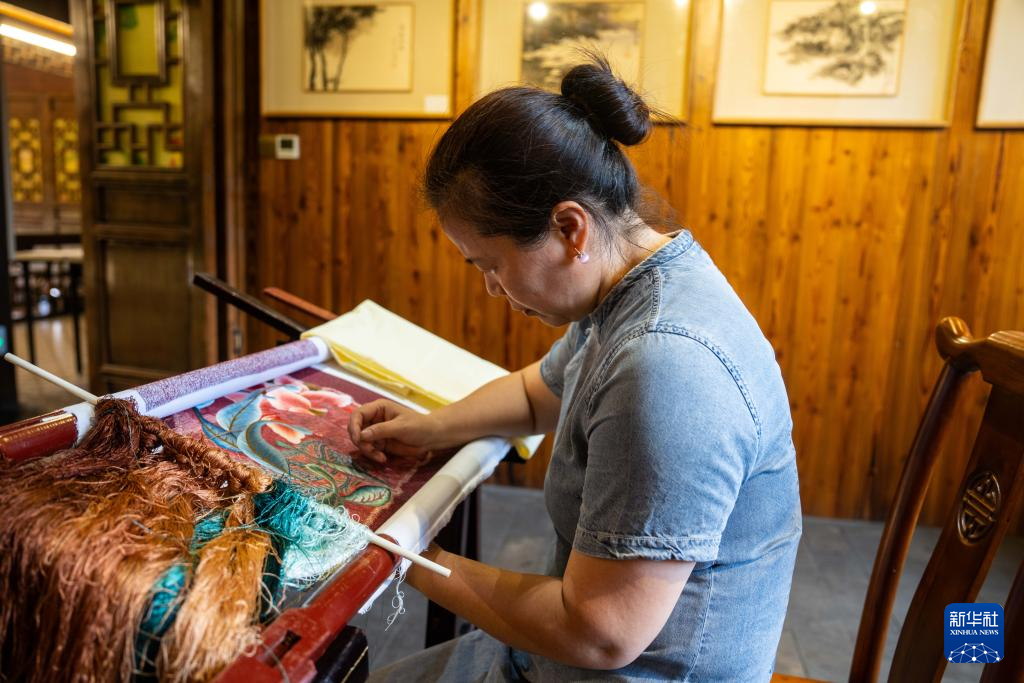 9月3日,在常德河街,桃源刺繡非遺傳承人羅明華展示刺繡技藝。