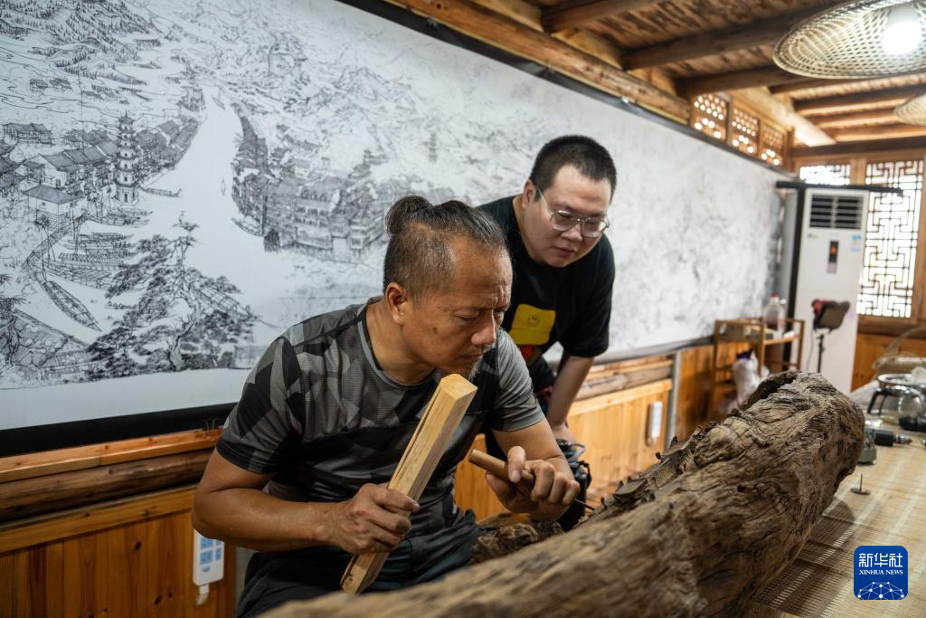 9月3日,在常德河街,潘氏藝術木雕非遺傳承人潘能輝(左)向游客展示木雕技藝。