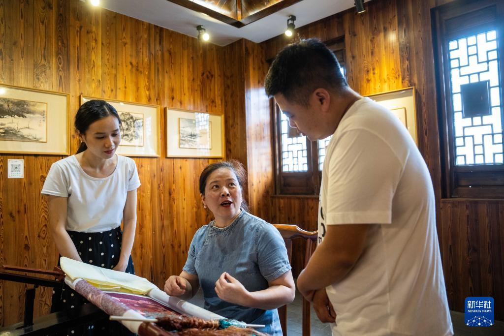 9月3日,在常德河街,桃源刺繡非遺傳承人羅明華(中)向游客講解刺繡技藝。
