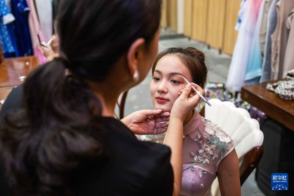 9月3日,在常德河街,國家級非遺項目常德絲弦的演員在演出前化妝。