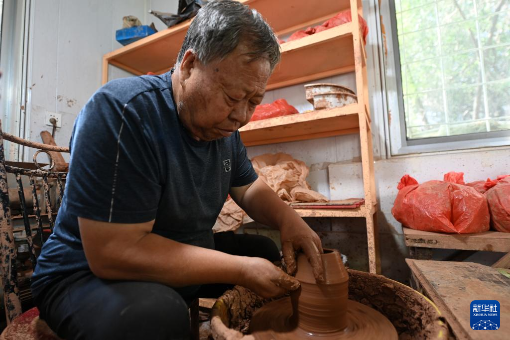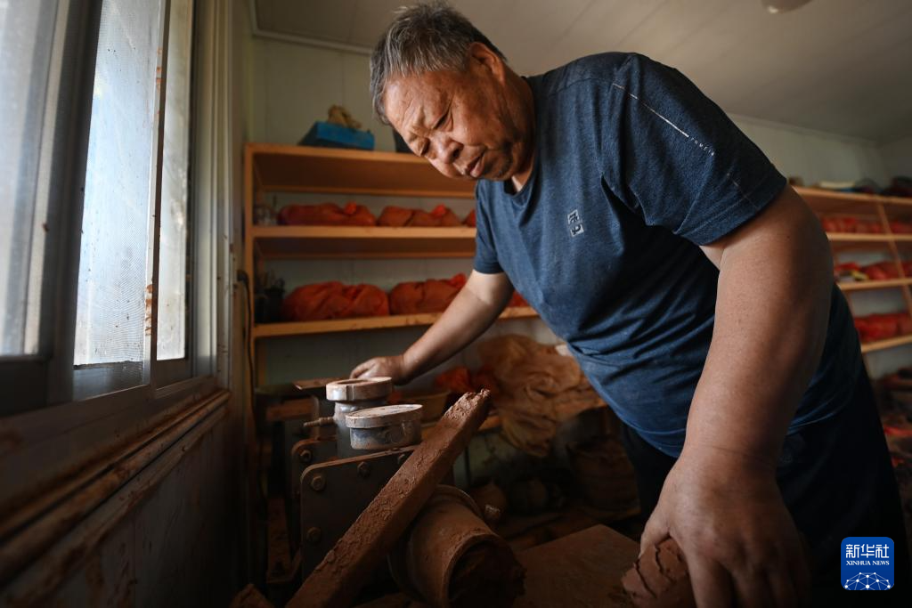9月3日,閻建林在家中制作彩陶泥坯。