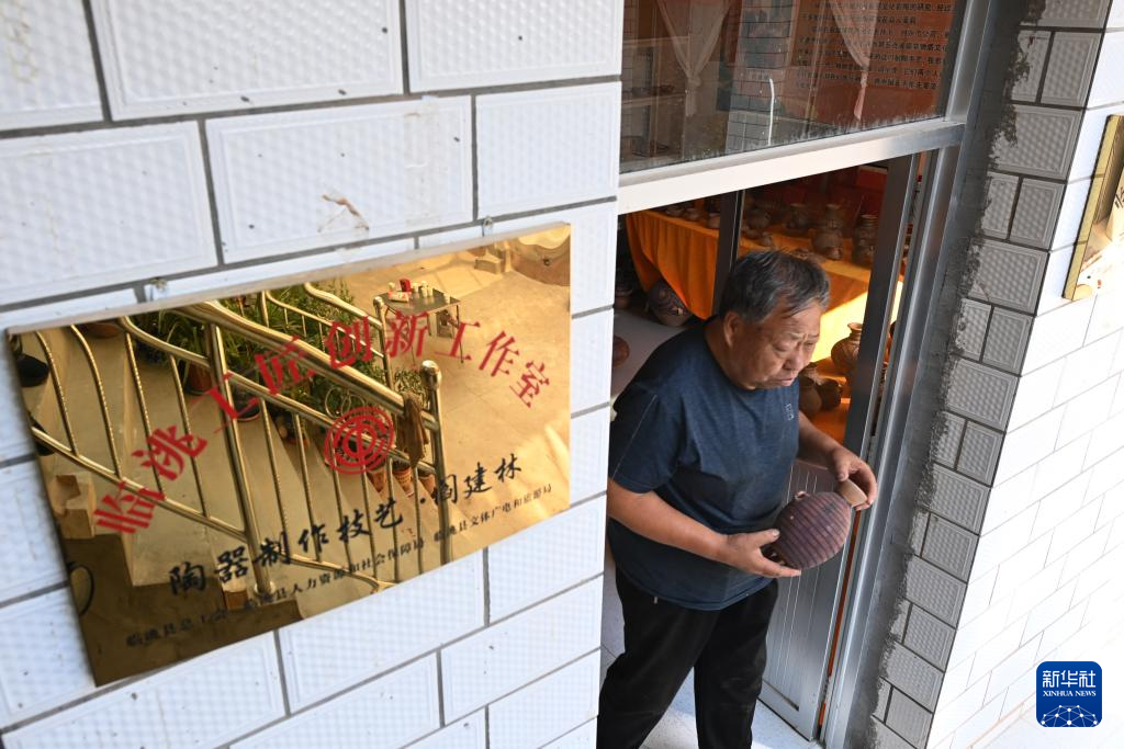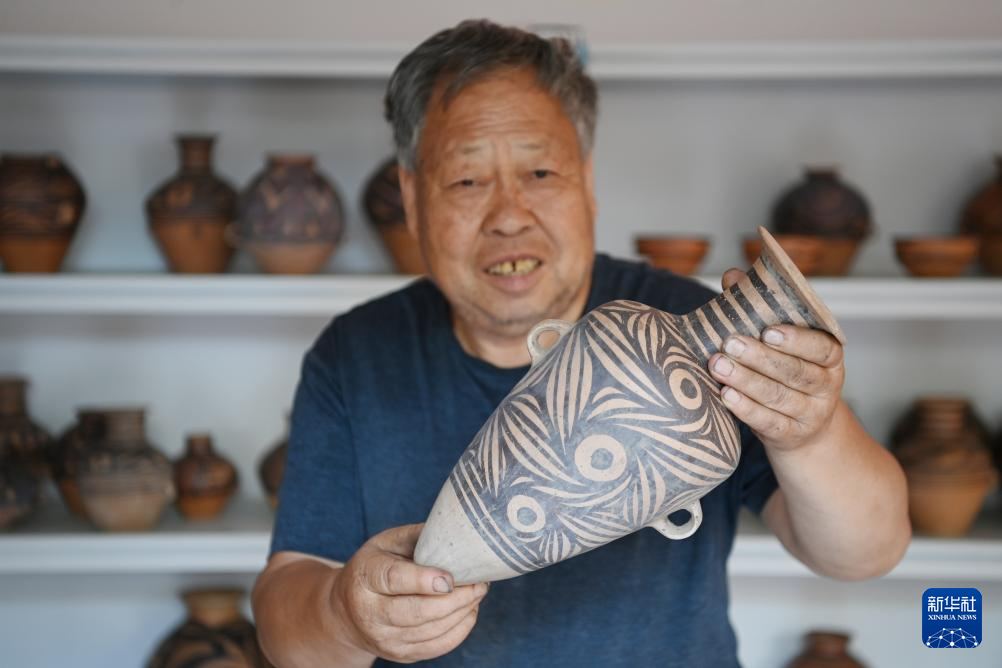 9月3日,閻建林在家中展示自己制作的彩陶工藝品。